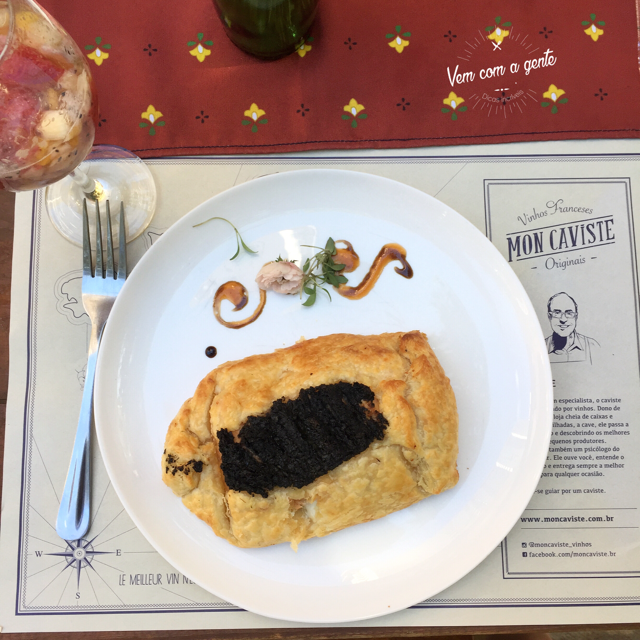 Salmão e queijo de cabra envoltos em massa folhada com tapenade R$58,00.
