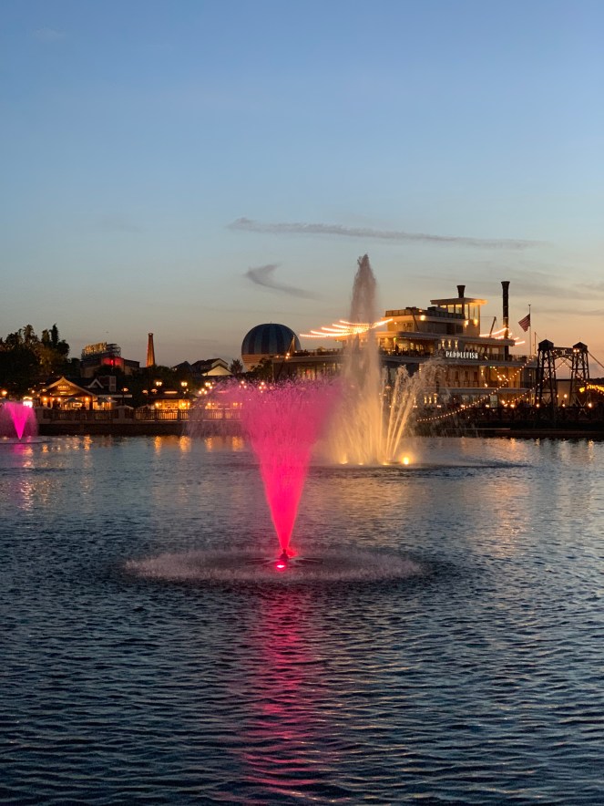 Vantagens: Estacionamento grátis, várias opções de restaurantes, lojas, atrações musicais e apresentações nas ruas e a atmosfera mágica da Disney!