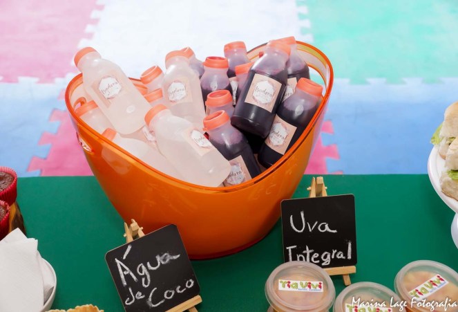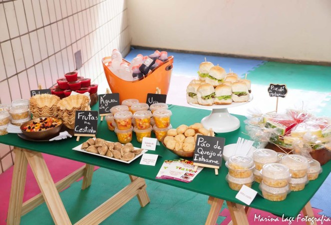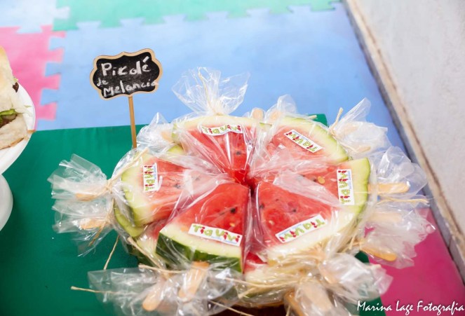 Como queríamos que a Isadora e seus amiguinhos aproveitassem a festa, pensamos em comidinhas especiais para eles. E a Tia Vivi Buffet Saudável fez tudo adaptado e com muito carinho para eles. Tinham Pão de Queijo de Inhame (Sucesso total), Pastel assado de frango, bolo de banana sem açúcar, Picolé de Melancia, Salada de frutas, milho, Suco integral, água de coco… os bebês e as crianças se esbaldaram! E foi super aprovado pela nossa Nutri Miranda Cirandinha!